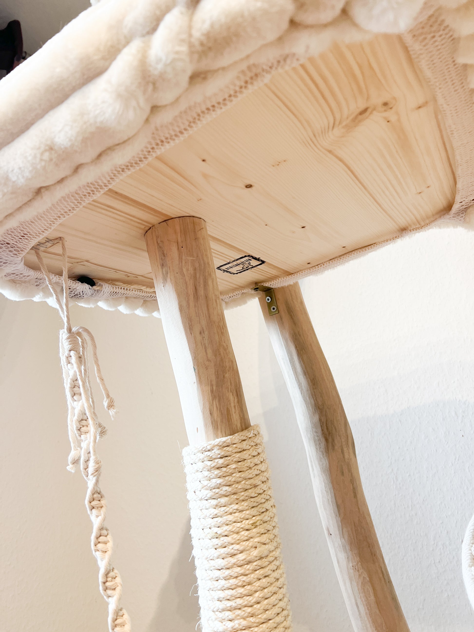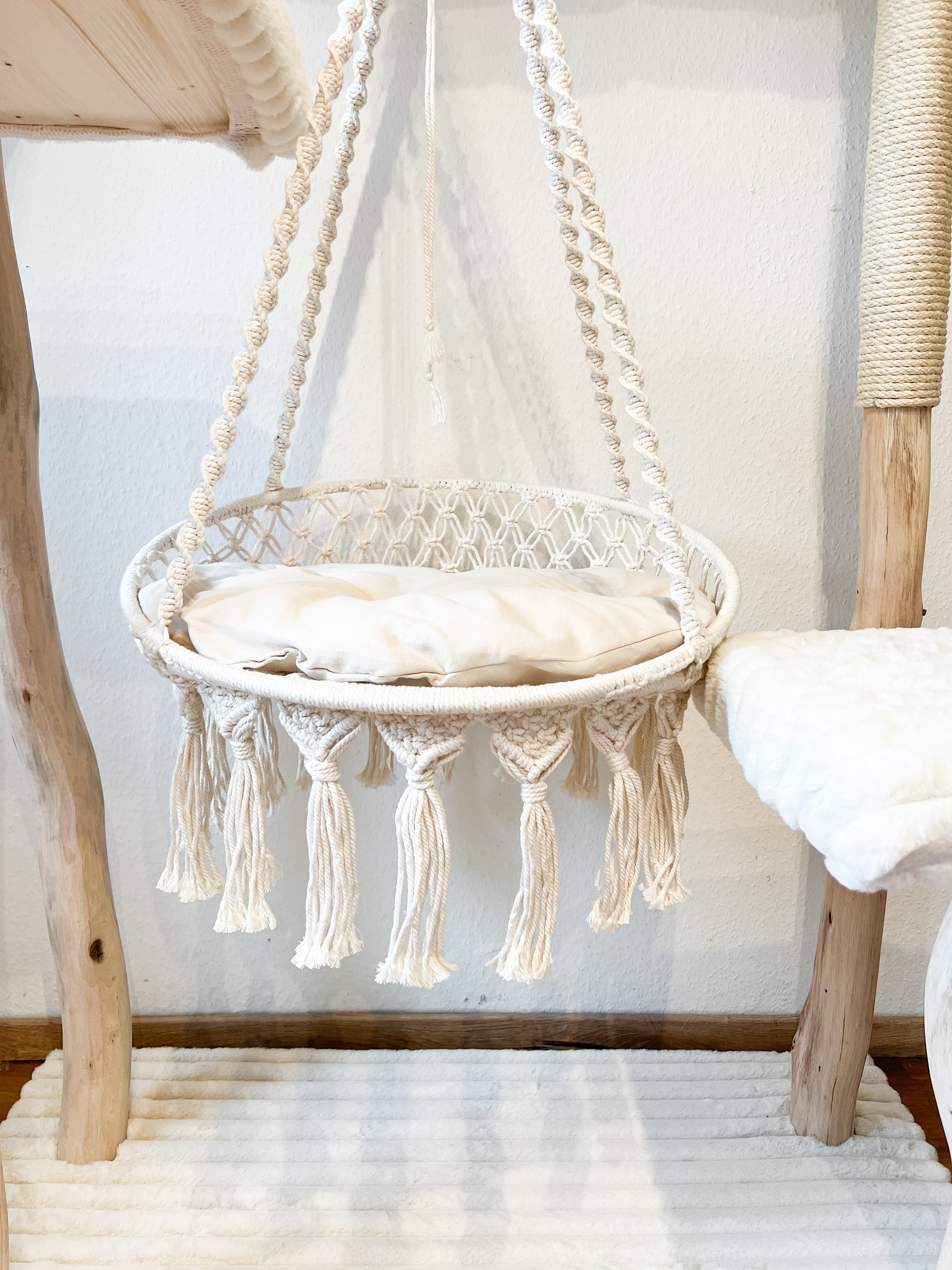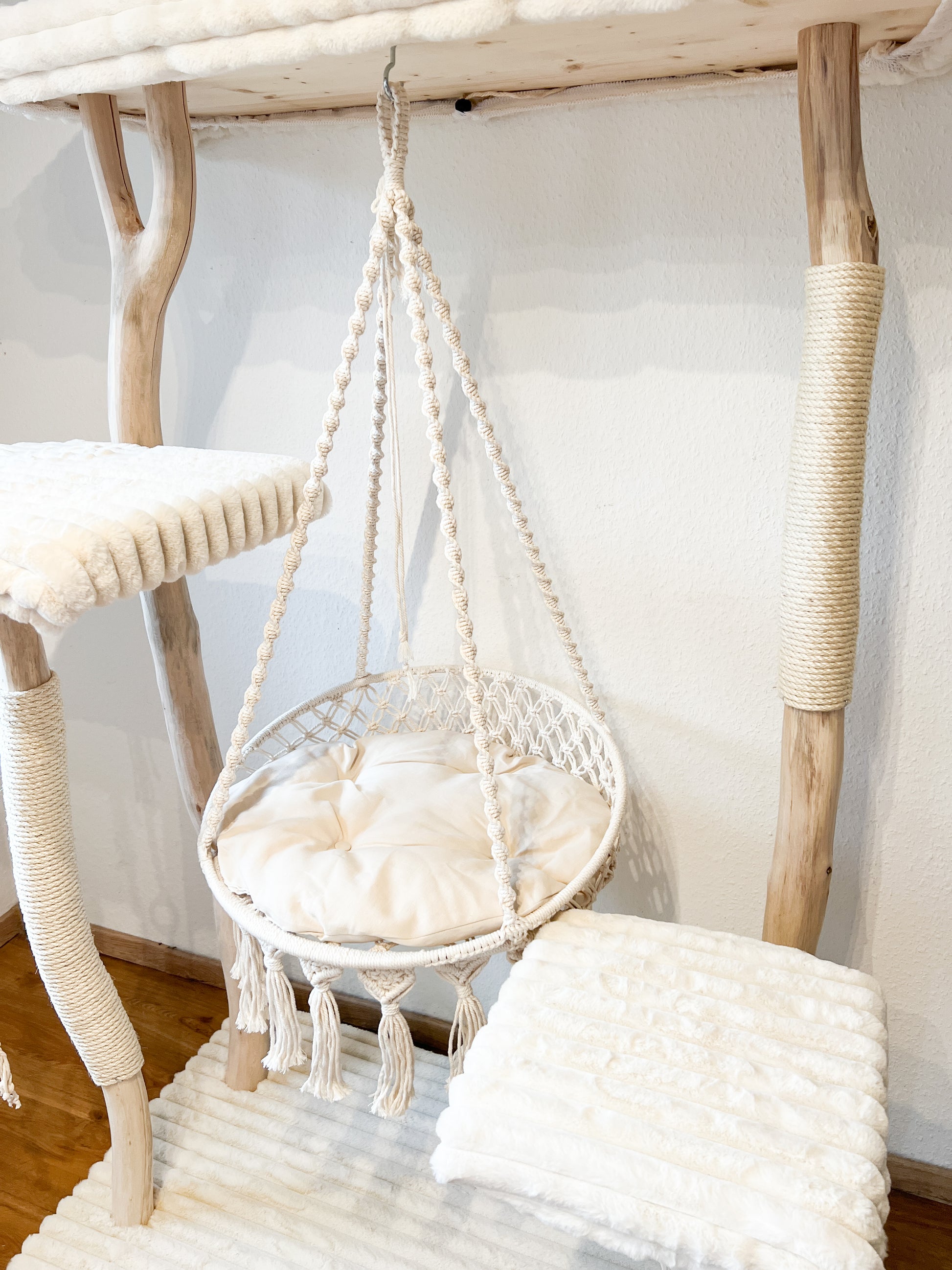 Zum einkuscheln gibt es einen handgefertigten Makramee-Hängesessel inkl. Kissen und dazu das passende Makramee-Spielzeug (handgemacht, extra stabil, auch für große Katzenrassen)